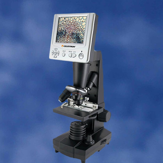 Microscopul digital cu ecran LCD inlocuieste ocularele cu un ecran luminos cu diagonala de 3,5 inch (88mm) facand astfel observatia individuala sau in grup mai usoara. Microscopul include si o camera digitala de 2 Megapixeli pentru a realiza fotografii si mici clipuri video cand fotografia nu e de ajuns. Fotografiile si clipurile pot fi stocate in memoria interna sau pe un card SD optional si transferate pe calculator prin cablul USB inclus. Lampile de iluminare inferioare si superioare a caror intensitate luminoasa poate fi reglata, precum si discul cu 6 filtre colorate permit obtinerea unor imagini luminoase, clare si contrastante a preparatelor studiate in orice conditii de iluminare a mediului ambiant. Acest microscop inovator este un instrument ideal pentru examinarea unei multitudini de preparate (acarieni, paraziti sau ouale lor, preparate histologice, etc.)