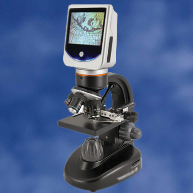 Microscopul digital cu ecran LCD inlocuieste ocularele cu un ecran luminos cu diagonala de 3,5 inch (88mm) facand astfel observatia individuala sau in grup mai usoara. Microscopul include si o camera digitala de 2 Megapixeli pentru a realiza fotografii si mici clipuri video cand fotografia nu e de ajuns. Fotografiile si clipurile pot fi stocate in memoria interna sau pe un card SD optional si transferate pe calculator prin cablul USB inclus. Ledurile de iluminare inferioare si superioare a caror intensitate luminoasa poate fi reglata, precum si discul cu 6 filtre colorate permit obtinerea unor imagini luminoase, clare si contrastante a specimenelor studiate in orice conditii de iluminare a mediului ambient. Acest microscop inovator este un instrument ideal pentru examinarea de aproape a unei multitudini de obiecte si preparate. Poate fi alimentat cu 2 baterii obisnuite ceea ce permite examinarea pe teren, deoarece nu depinde de o sursa de alimentare.