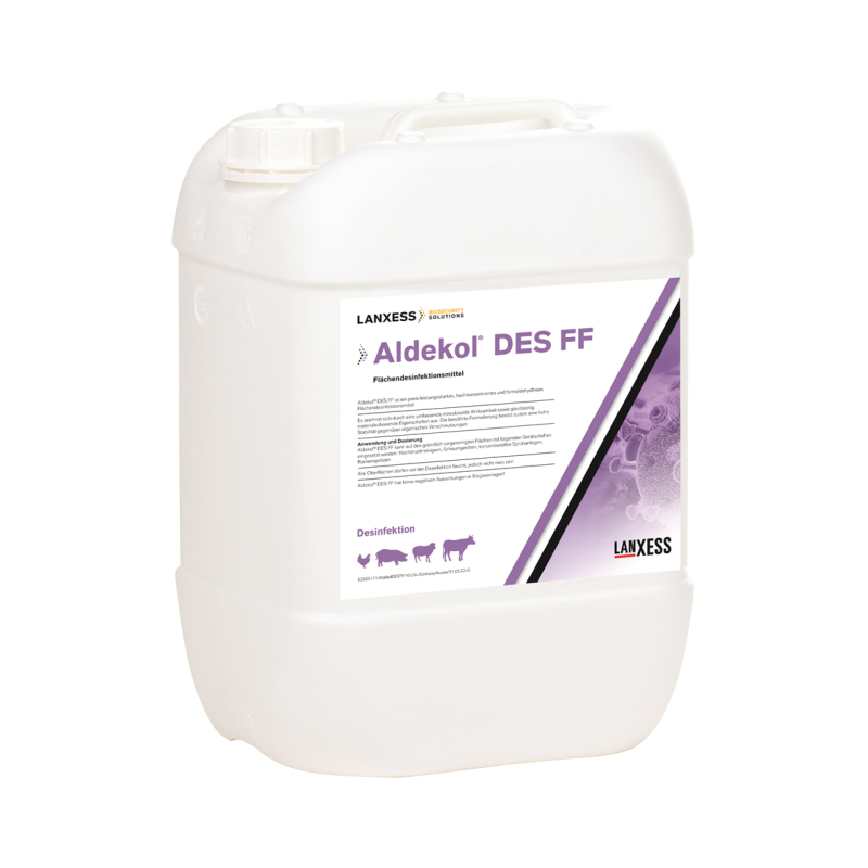 EWABO ALDEKOL DES FF este un dezinfectant sofisticat, cu spectru larg, utilizat pentru igienizarea si dezinfectia fermelor, incubatoarelor, abatoarelor, laboratoarelor si clinicilor veterinare, precum si a tuturor tipurilor de echipamente. Are urmatoarele caracteristici generale : are efect virulicid, bactericid, fungicid si algacid, este usor si sigur de utilizat, este economic datorita concentratiilor de utilizare extrem de reduse, este activ in prezenta materiilor organice, are o actiune prelungita in timp, solutia diluata nu este coroziva sau distructiva,este aproape complet biodegradabil, poate fi utilizat la temperaturi scazute, in ape dure sau saline, nu contine fenol sau formaldehida. ALDEKOL DES FF este atestat ca virulicid, bactericid si fungicid de catre experti independenti si institute de cercetare reputate.